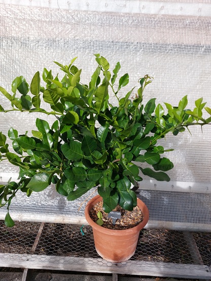 21.10.2018 einwintern. Die Kaffirlimette ist sehr wüchsig, trägt aber ungern Früchte. Das macht aber nichts, weil ich diese ja doch nicht gebrauchen kann und am Strauch sieht man sie auch kaum weil sie grün wie das Laub sind. Vor der Strauch ins Treibhaus kam wurde er stark zurückgeschnitten.